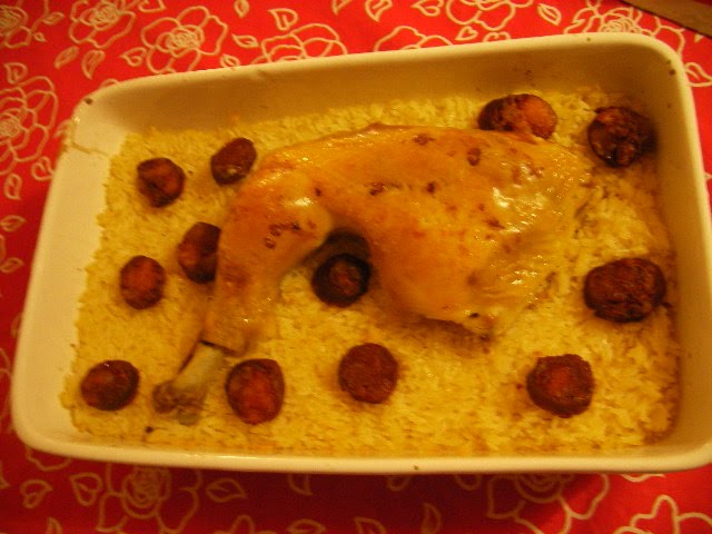 Num tacho deitei um fio de azeite, um cebola picada e 2 dentes de alho picados. Deixei alourar, mexendo sempre para não pegar.